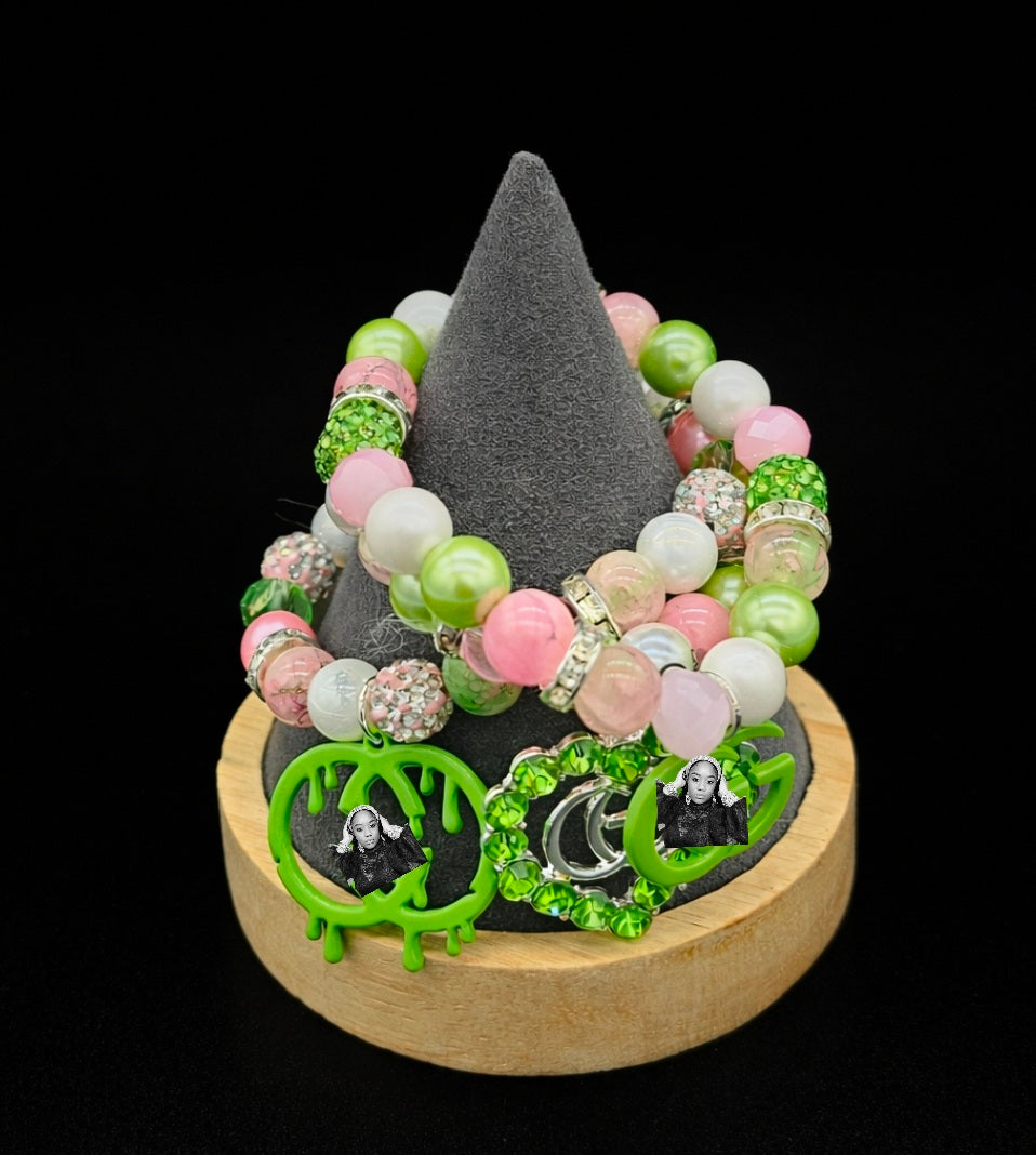 3pcs Pink and Green beaded stretch bracelets with GG inspired charms.