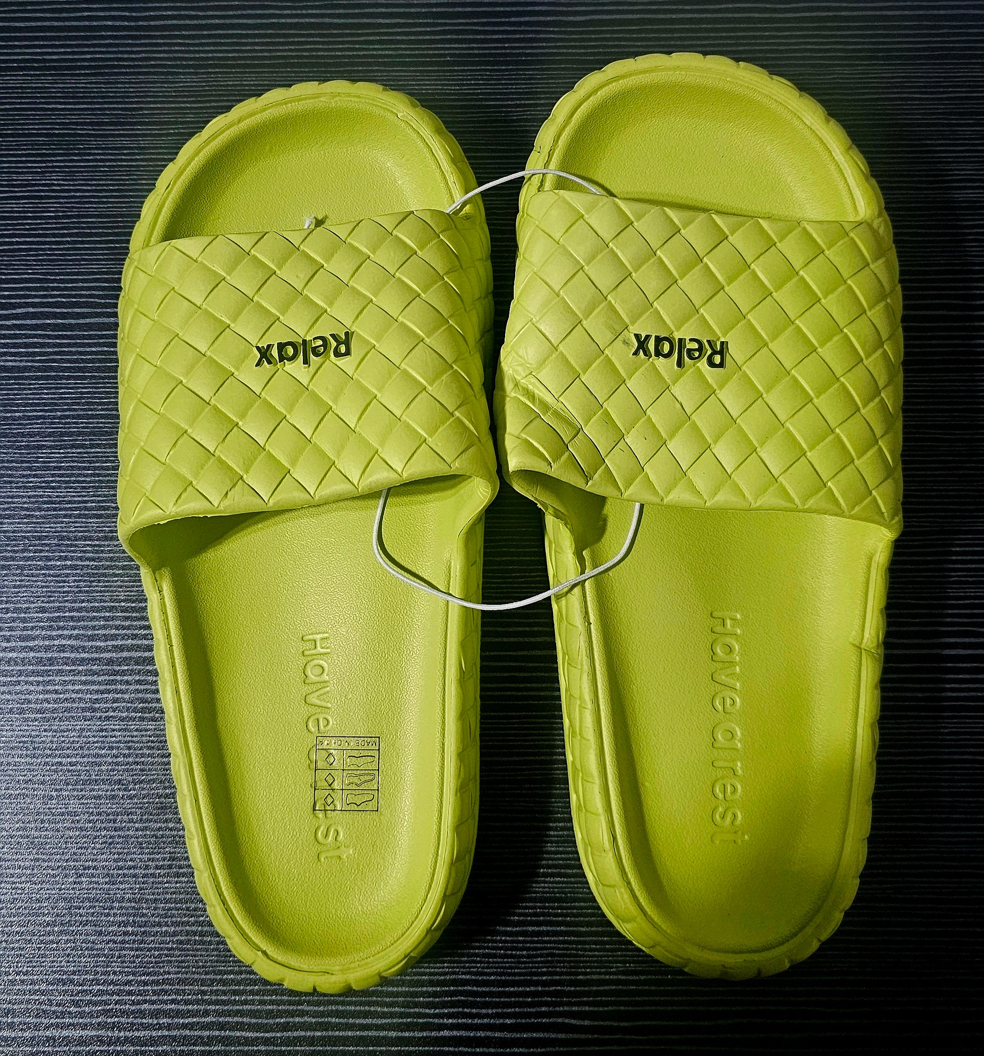 Signature Styling: The wide strap features a chic quilted texture and a clear message: "Relax". The insole reiterates the theme with "Have a Rest" printed clearly.