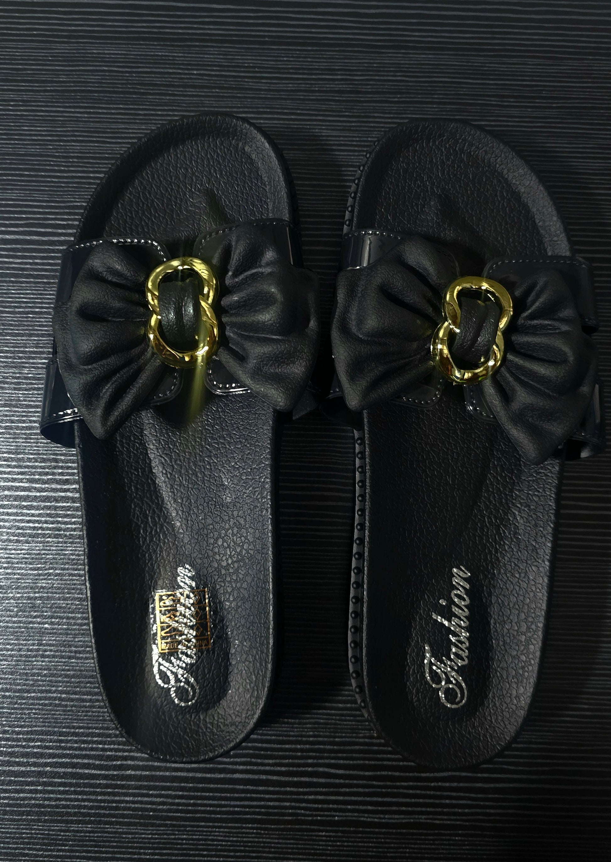 Unleash your inner glamour, even in your most relaxed moments. These slides offer a perfect balance of comfort and high-impact style. The centerpiece is the oversized, perfectly pleated fabric bow, cinched dramatically by a polished gold interlocking ring. The sleek, durable sole makes them the ideal choice for looking put-together instantly. They are not just shoes; they are an accessory.
